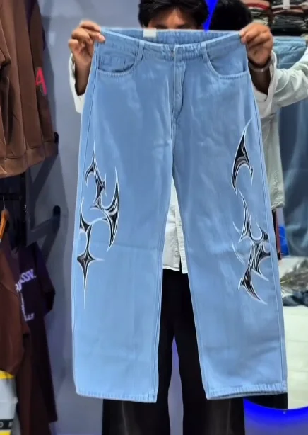 The tribal print adds artistic edge, making this piece highly suitable for styling with crop tops, oversized shirts, sneakers, structured jackets, and premium accessories. This type of denim performs strongly in high CPC fashion searches linked to luxury casual wear, trend denim collections, statement jeans, and premium street-style wardrobes.